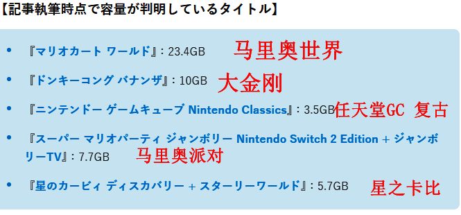 ·目前已经判明的部分Switch 2平台新游戏容量,同样的首发游戏《大金刚》只有10GB,当然任天堂自家的游戏不能一容量来衡量好玩与否。