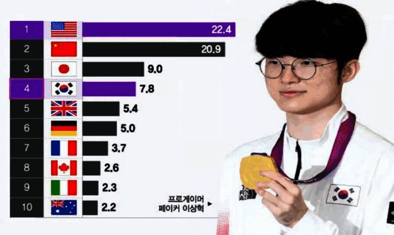 ·其中韩国占据世界全部游戏产业份额的7.8%,首位是美国,约为22.4%,亚军则是中国,位20.9%,第三位则断层式降为9.0%,英国占据第五位,然后是德国与法国。