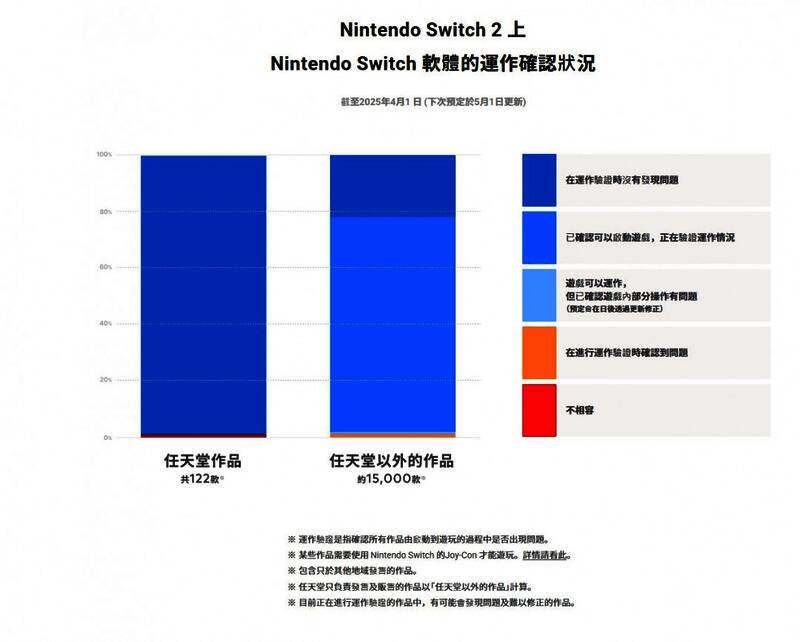 根据任天堂中国香港官网发布的消息,按照2025年4月1日更新的数据,Switch游戏在Switch 2上的兼容性测试显示出整体良好的向下兼容性: