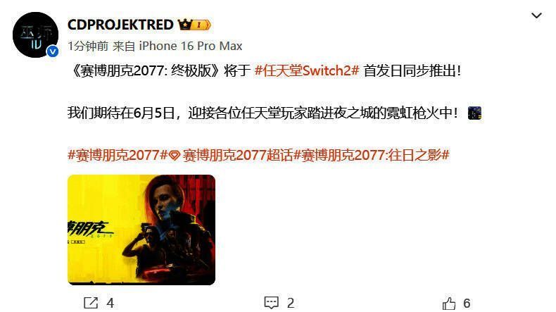 《赛博朋克2077:终极版》将作为Switch 2首发护航游戏,在6月5日随Switch 2同步推出。