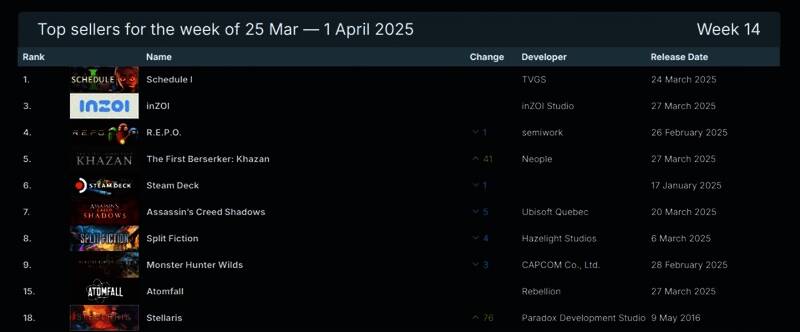 Steam 2025年最新一周游戏销量排行榜出炉(2025年3月25日-2025年4月1日,无免费游戏),本周有多款新作首发上榜,包括:《inZOI》、《第一狂战士:卡赞》、《原子陨落》。