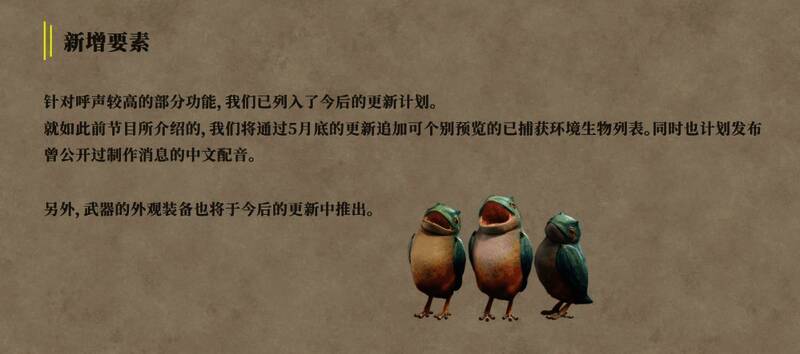 Capcom官博宣布《怪物猎人:荒野》计划在5月底更新,追加中文配音。此外官网还公布了4月和5月更新内容计划。