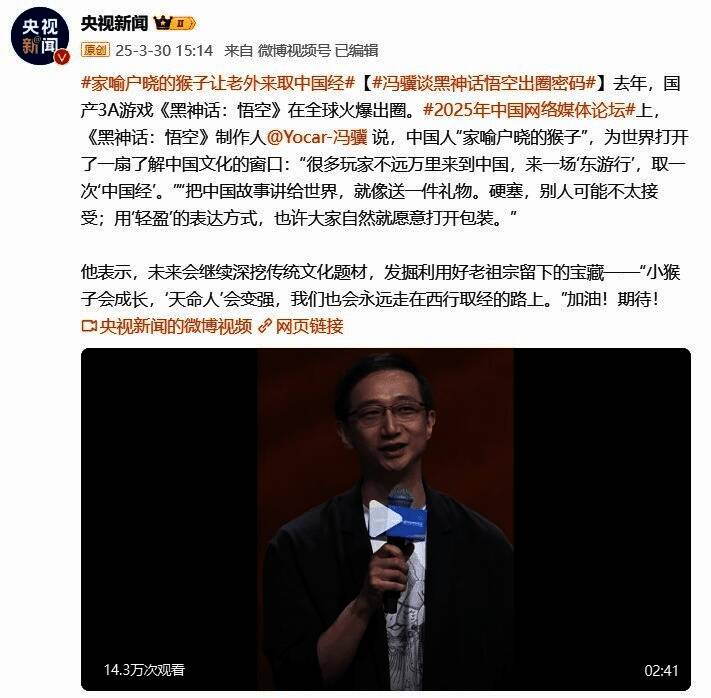 近日据央视新闻报道,在2025年中国网络媒体论坛上,《黑神话:悟空》制作人冯骥说,中国人“家喻户晓的猴子”,为世界打开了一扇了解中国文化的窗口:“很多玩家不远万里来到中国,来一场‘东游行’,取一次‘中国经’。”