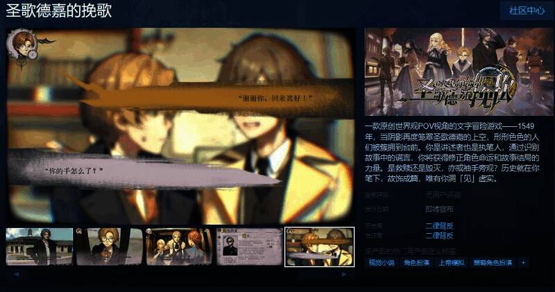 今日(4月1日),文字冒险游戏《圣歌德嘉的挽歌》Steam页面开放,发行日期待定,游戏支持简体中文,感兴趣的玩家可以点击此处进入商店页面。