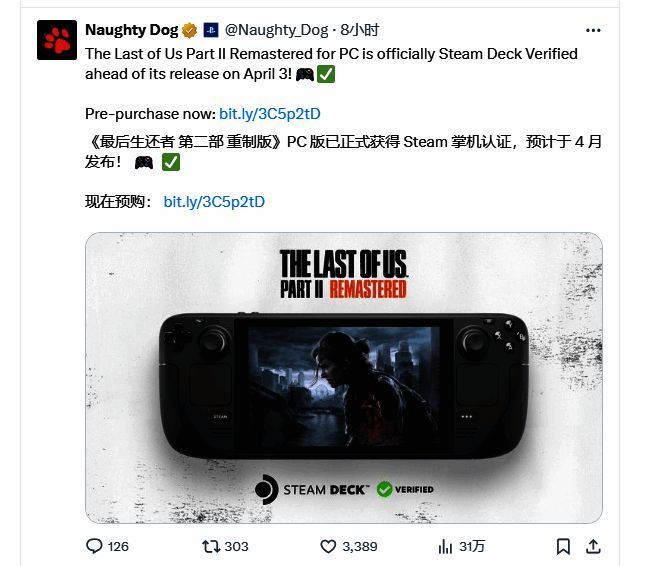 近日,顽皮狗已正式宣布,《最后生还者2重制版》已通过Steam Deck认证,本作将于2025年4月4日发售。登陆Steam和Epic平台,Steam国区游戏售价345元,支持中文,感兴趣的玩家可以点击此处进入商店页面。