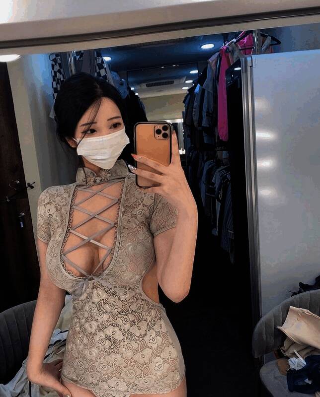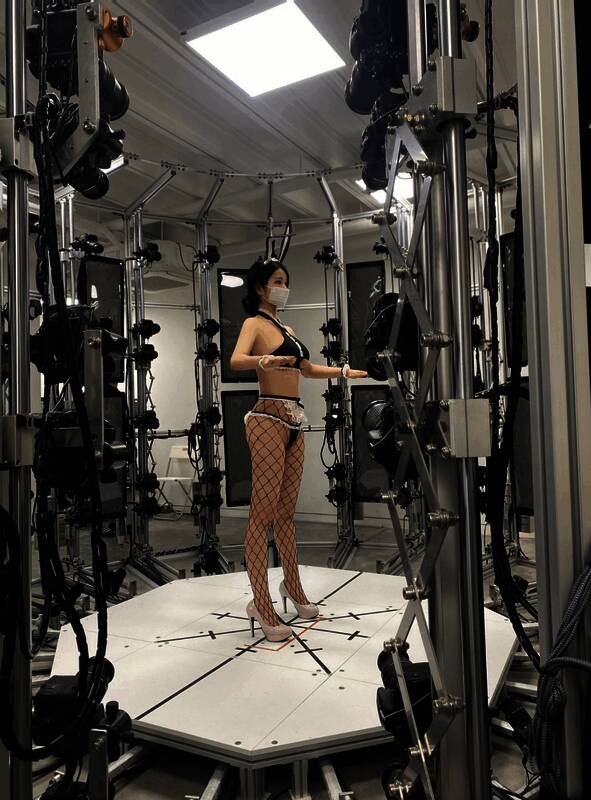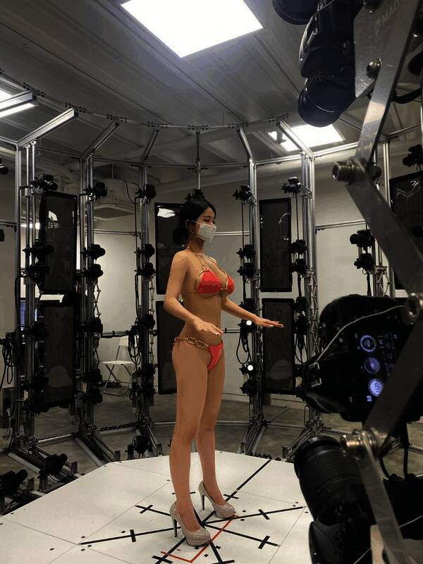 从图中可以看到,尹雪花身穿比基尼和渔网袜等性感服装,大量摄像设备对准她的身体扫描,进行模型采集工作。
