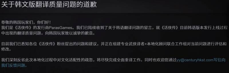 近日武侠RPG《活侠传》新更新上线,加入了韩文支持和新支线剧情。然而韩文翻译质量不佳,让许多韩国玩家不满。更令中国国内玩家不满的是,去年引发争议的“龙湘事件”剧情又回归了,让许多人狂骂并打差评。