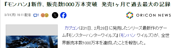 卡普空于3月31日今天宣布,2月28日发售的《怪物猎人:荒野》全球销量突破1000万,这也刷新了旗下游戏发售一个月最高的销量记录。