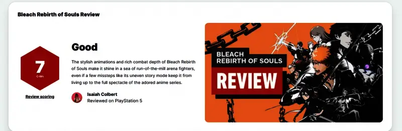 近日,万代南梦宫的《死神:魂魄觉醒(BLEACH Rebirth of Souls)》正式发售,本作一款基于热门动漫世界观打造的全新格斗游戏。IGN评价为拥有超越同类作品的独特魅力,并打出了7分的评分。