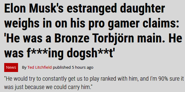 ·重点是,马斯克喜欢使用托比昂这个英雄,但是水平烂到出奇,只能排在游戏最底层的青铜段位,在评说马斯克的游戏水平时,使用了fucking dogshit的极端词语形容,虽然不排除目前两人关系不佳的影响,但是已经足够说明问题了。