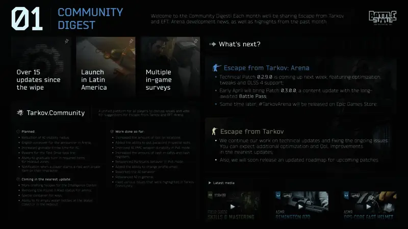 官方表示:“在第一期中,我们将总结自 2025 年初以来的开发进度,讨论《塔科夫》社区项目——一个收集玩家反馈的统一平台。”
