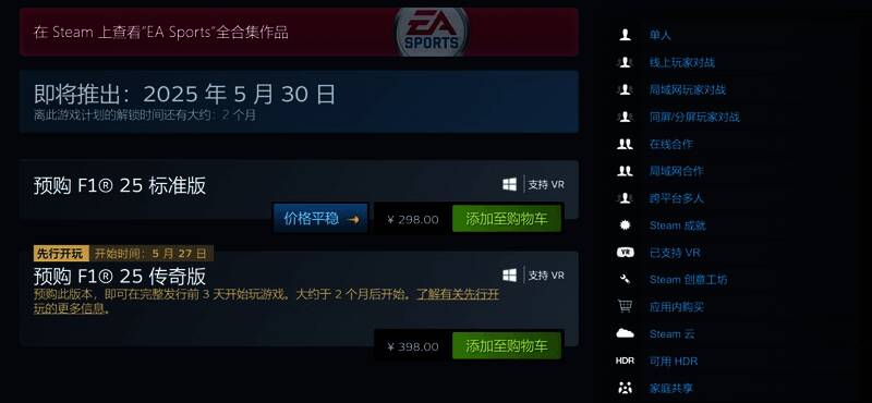 EA宣布《F1》系列最新作《F1 25》将于5月30日发售,Steam国区标准版298元,支持简体中文和中文配音。传奇版398元,预购传奇版的玩家可提前三天游玩游戏。