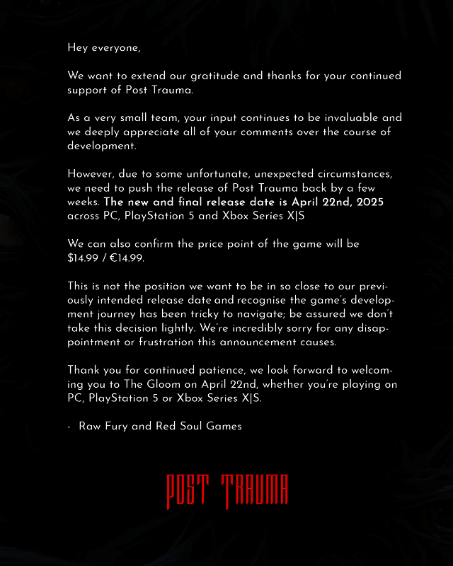 3月26日,由RED SOUL GAMES开发的生存恐怖游戏《Post Trauma》宣布将延期至4月22日发售,定价14.99美元(约合人民币109元),该作原定于3月31日推出,登陆PS5、Xbox Series X|S和PC,官方给出的延期理由是“由于一些不幸的意外情况”。