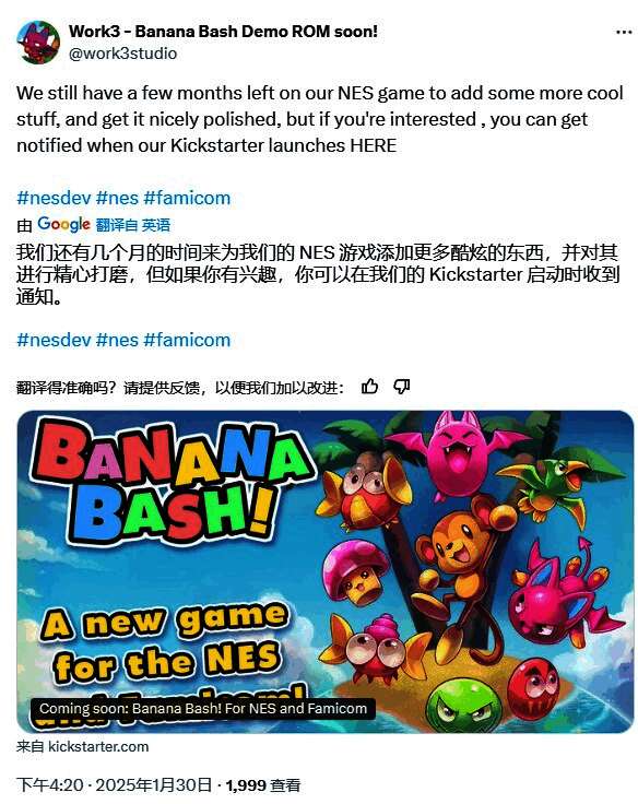 目前Work3工作室正在全力推广他们的新作《Banana Bash!》。这是一款街机风解谜游戏,并且将首次以4Mb卡带形式登陆NES平台。玩家将操控主角猴子在多个关卡中摆荡穿梭,一边躲避敌人一边收集水果》——这玩法让人想起经典游戏《吃豆人》。游戏将通过2025年6月启动的Kickstarter众筹筹集资金。