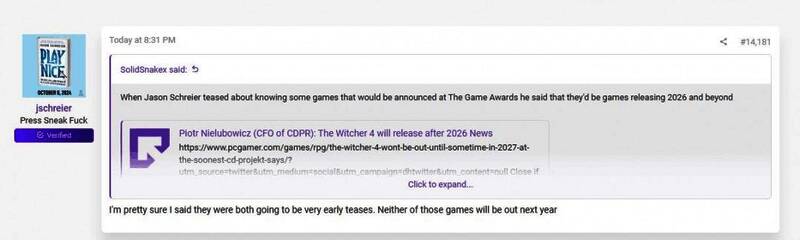 在ResetEra论坛上,Jason Schreier表示《星际:异端先知》在TGA 2024上公布的预告只是一个“非常早期”的预告,这款游戏不会在2026年推出。