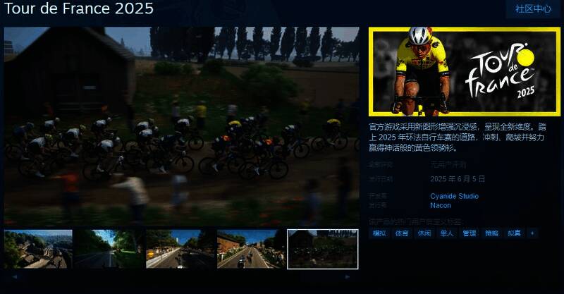 今日(3月26日),模拟《环法自行车赛2025》Steam页面上线,游戏暂不支持中文,预计于2025年6月5日发售,感兴趣的玩家可以点击此处进入商店页面。