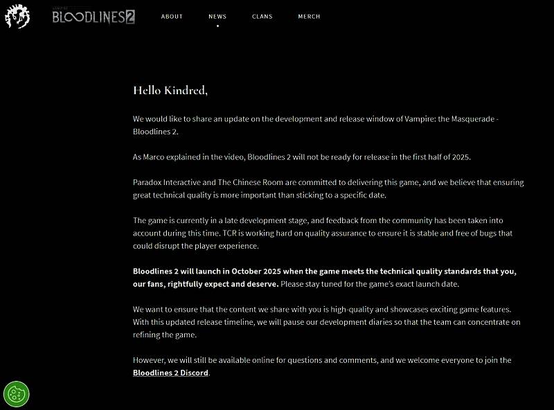此外Paradox还在声明中补充道:“《吸血鬼:避世血族2》将于2025年10月推出,届时游戏将达到我们粉丝所期望和应得的技术质量标准。”同时Paradox也指出具体的发布日期将在稍后公布。
