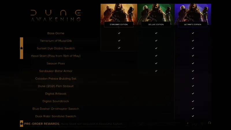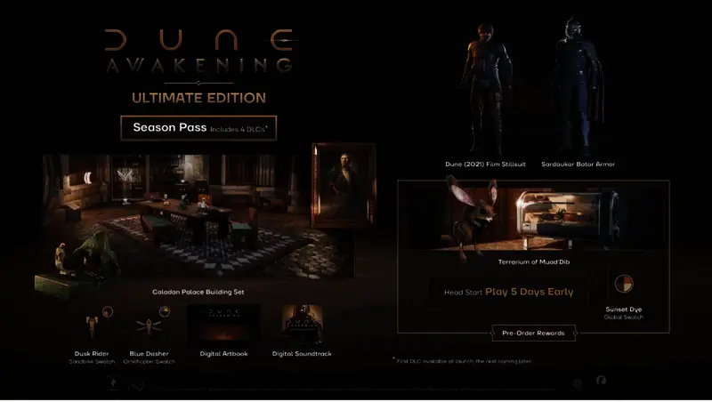 《沙丘:觉醒》标准版售价为(160元人民币),豪华版(230元人民币)和终极版(300元人民币)均为玩家提供5天抢先体验,并包含多种独特物品。作为豪华版和终极版的一部分,游戏还包含季票,将逐步解锁四个DLC,首个DLC将在发布时解禁。