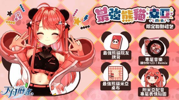 《天月麻雀》于此次版本更新中公布全新联动,邀请到本次为新雀士「妲己」配音的的香港Vtuber 米亚Mya 合作,推出限定礼包【最强熊猫米亚】。礼包中将包含两首联动音乐、两款限定表情及米亚Mya 主题装饰物套组。此外,本次联动更会送出两款联动表情及立直棒,详情将会于《天月麻雀》社交平台公布。