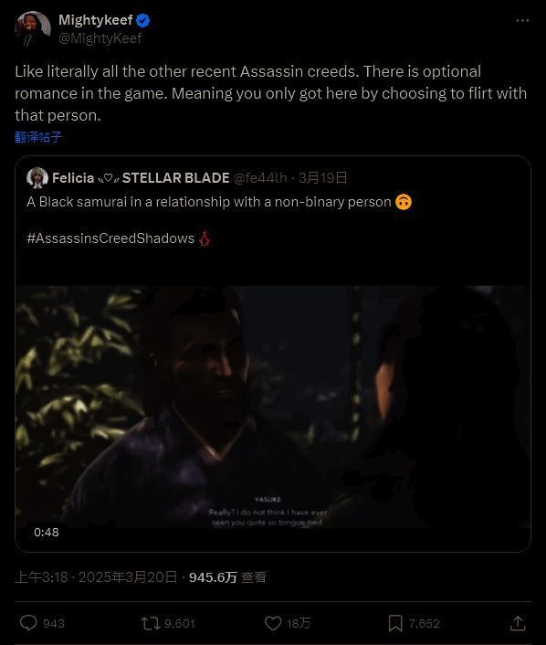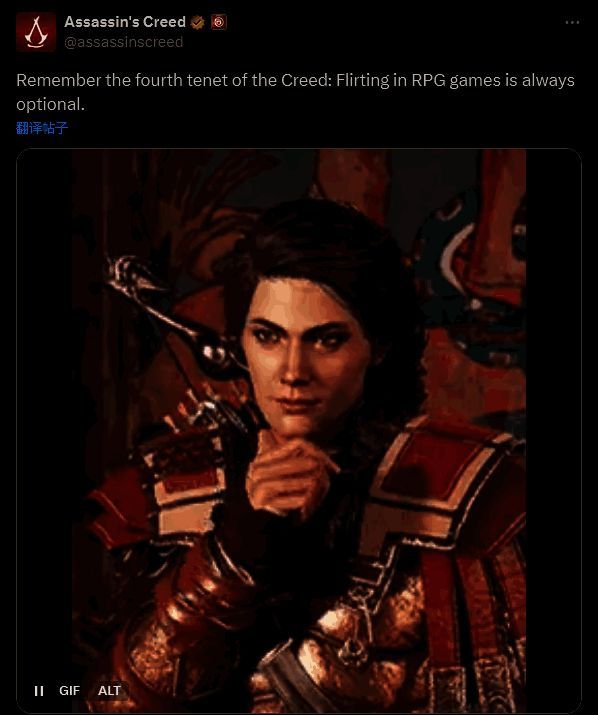 他的回应更是得到了《刺客信条》育碧官方社交媒体账号的支持。官方账号转发了他的评论,并提醒玩家:“记住(刺客的)信条中的第四信条:RPG游戏中的调情永远是可选的。”