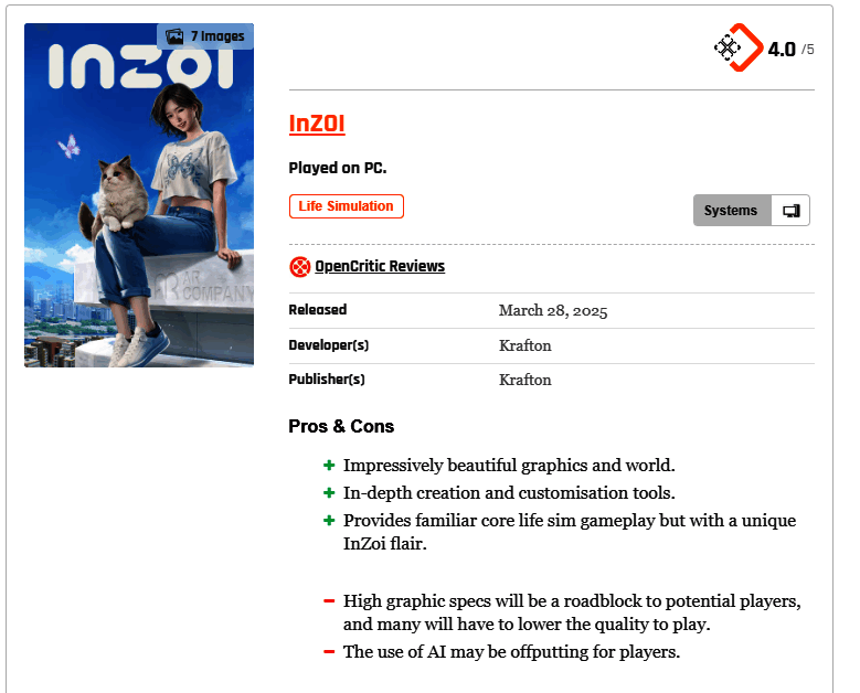 生活模拟游戏《inZOI(云族裔)》采用虚幻5(UE5)引擎精心打造,并引入了AI系统,以其独特的玩法、丰富的游戏内容和高度自由度的定制系统,在全球范围内都赢得了广泛好评。目前,该游戏媒体评分已经正式解禁,其中知名外媒GameSpot为本作给出了6分的评价,媒体TheGamer给出了8分的评价。