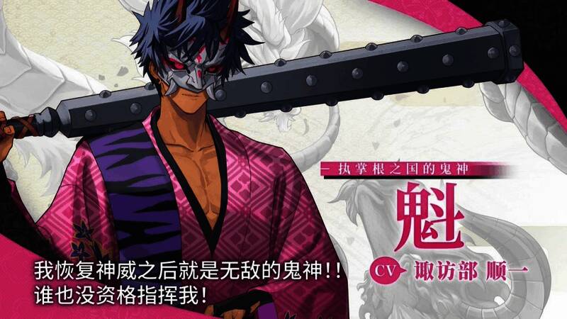 “魁”以力量自豪,鬼族头领的身份令人生畏。性格阳光又带着些许傲气。言辞虽然有些粗鲁,但非常关心手下。平时佩戴面具,从不让人看到真面目。