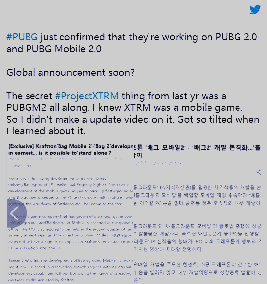 近日,知名爆料者PlayerIGN在推特上透露,Krafton正在紧锣鼓地开发《绝地求生》的续作。这款备受期待的游戏,不仅将包含PC和主机端的《绝地求生2》,还将同步推出移动端的《绝地求生2.0》。PlayerIGN在推文中写道:“Krafton已全面投入下一代《绝地求生》的开发工作,这款多平台游戏即将与玩家见面,移动、PC和主机平台将同步战火重燃。”