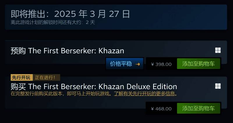 由韩国知名网游开发商Neople(《地下城与勇士》)开发、Nexon发行的动作游戏《第一狂战士:卡赞》已在昨天(3月24日)于全平台开启了抢先体验,Steam平台标准版售价398元,豪华版468元(预购豪华版的玩家可提前三天游玩游戏)。