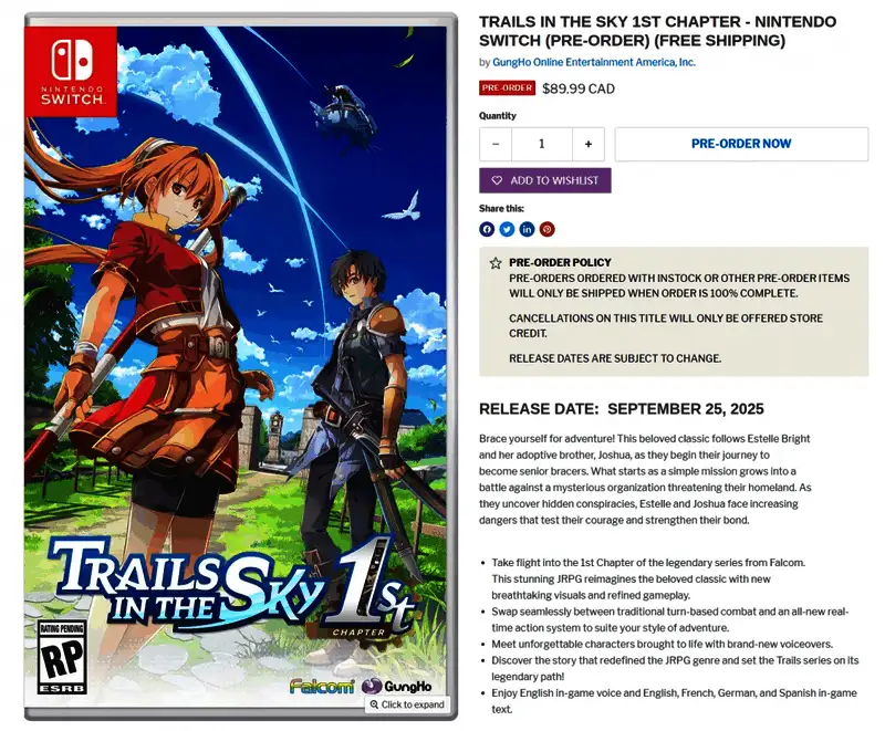 根据游戏零售商VGP的商店页面显示,《空之轨迹the 1st》将于9月25日发售,此前开发商Falcom仅确定了该作将在年内发售,尚无法确定该日期是否为零售商意外泄露,目前该日期仍然存在于商店页面中。