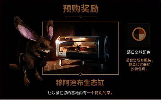 请注意,虽然预购标准版游戏可以获得穆阿迪布生态缸和日落全球配色,但只有预购豪华版和终极版才可提前5天抢先体验游戏。