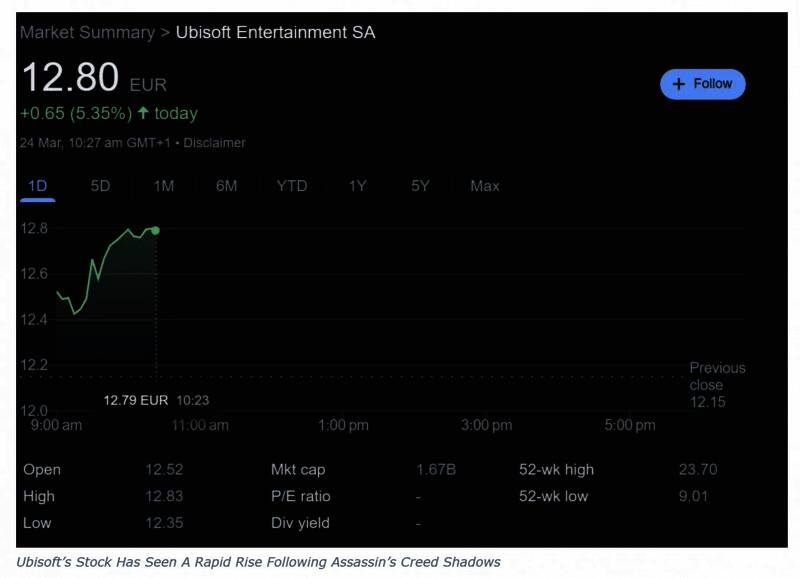 育碧整个公司的命运就压在了《刺客信条:影》这一个游戏上,该作的任何风吹草动直接牵动着无数投资人紧张的神经。看起来刚发售没多久的《刺客信条:影》让育碧稍微缓了一口气,因为就在《刺客信条:影》Steam峰值来到系列最高后,该公司的股价上涨了5%。