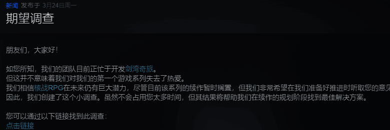 开发发行商AtomTeam今天宣布,旗下好评名作《核爆RPG》是否会推出续作游戏将听取玩家的意见,新的玩家期待度调查开启,感兴趣的玩家可以去投上一票。