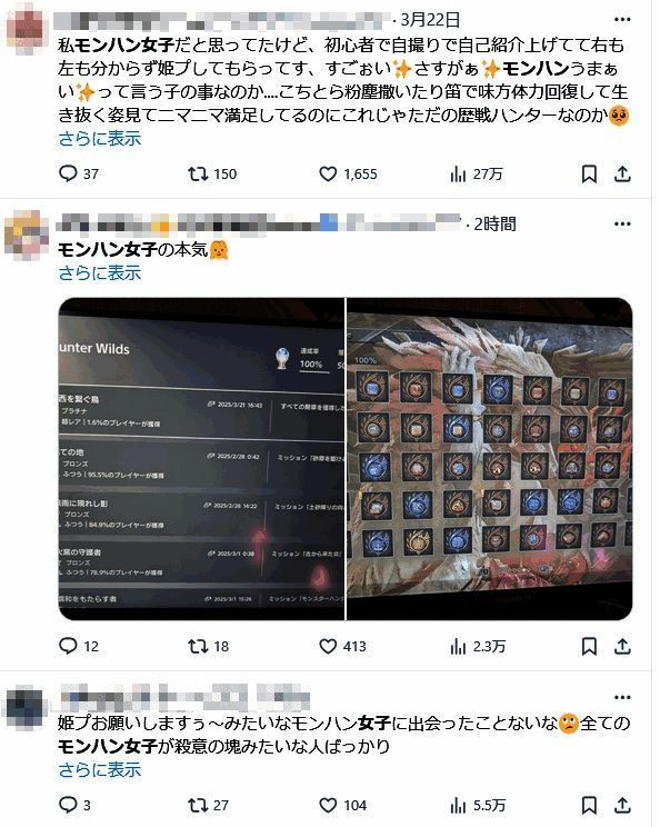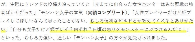·这些自称“怪猎女子”的女性玩家还喜欢自晒“美照”和游戏过程,不过大多数网友表示应该都是些被男性玩家们宠爱着的“公主猎人”吧,毕竟这么难的游戏不太适合女生。
