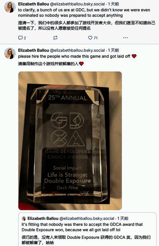 近年来行业竞争异常残酷,这一事件深刻揭示了当前游戏行业的严峻现状。《奇异人生:双重曝光》的叙事设计师Elizabeth Ballou在Bluesky上写道:“没人去领GDCA奖很合适,因为我们都被裁了,哈哈。我们中的一些人参加了GDC,但我们甚至不知道自己被提名了,所以没人准备好去领奖。”