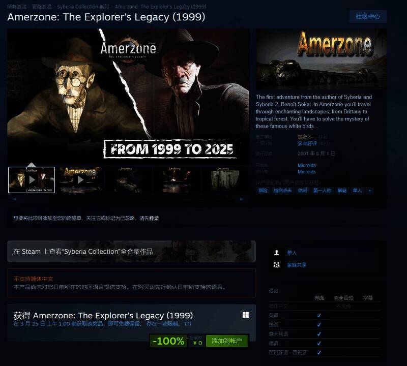 近日本作在Steam平台开启了限时免费领取活动,据了解本作目前暂不支持中文,活动将持续到3月25日上午1:00前,感兴趣的玩家只需进入《Amerzone:探险家的遗产》的Steam主页,点击上面的“添加到账户”按钮,即可入库。