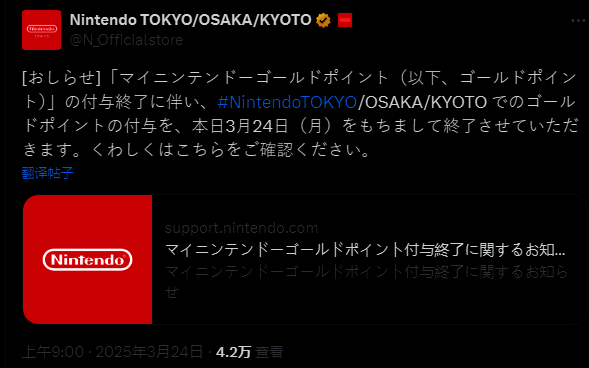 3月24日今天,任天堂官方宣布,因为即将于3月25日明天中午起终止My Nintendo黄金点数,今天则是任天堂东京与大阪和京都的实体店购买游戏赠送黄金点数最后1天。