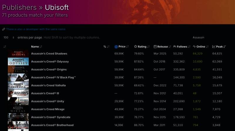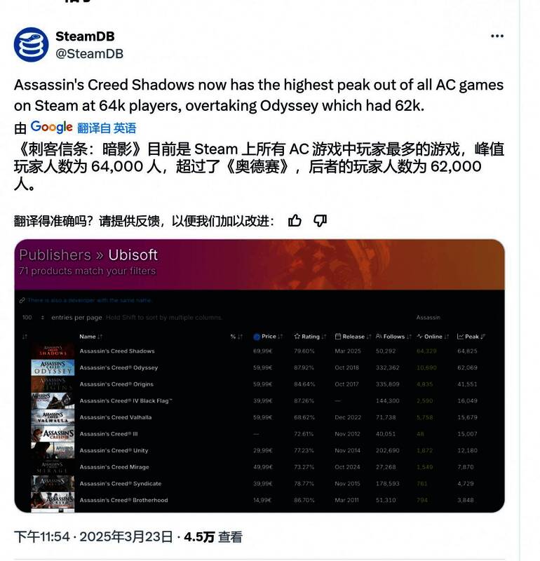 SteamDB官推宣布,《刺客信条:影》Steam在线峰值达到64825人,终于超过2018年游戏《刺客信条:奥德赛》(62069人),正式成为该系列在Steam平台在线峰值最高的一作。