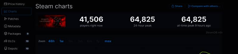 此外,《刺客信条:影》Steam首发峰值仍然还没有超过去年扑街的EA游戏《龙腾世纪:影障守护者》,后者Steam在线峰值接近9万人。