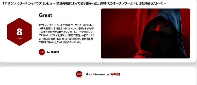 《刺客信条:影》IGN日本评分8分,IGN日本称赞该作拥有“技术革新所开创的全新开放世界与引人入胜的故事。”