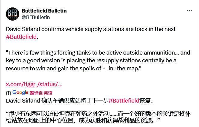 此外,新《战地》制作人David Sirland确认载具补给站将在新作中回归: