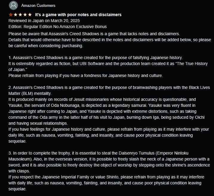 用户点赞最多的评论指责《刺客信条:影》是一款以“伪造日本历史为目的制作的游戏”,以“黑命贵(BLM)”意识形态给玩家洗脑,不尊重皇室。