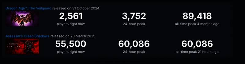 《刺客信条:影》Steam在线峰值仅6万人左右,不及《龙腾世纪:影障守护者》,后者Steam同时在线峰值接近9万人,但EA仍将《龙腾世纪:影障守护者》视为重大失败。