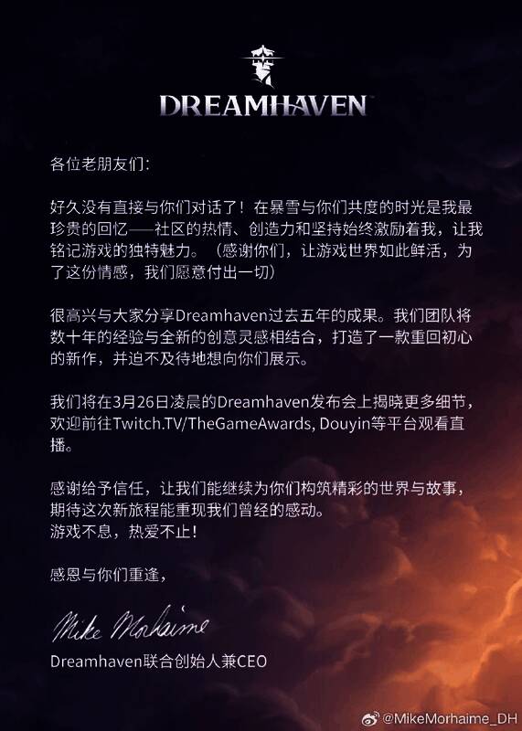 昨天,暴雪联合创始人之一老麦(Mike Morhaime)入驻了国内社交媒体微博,发布了首条消息。老麦表示,他的新公司Dreamhaven全新作品即将揭晓,自己也会在本月底来中国,为中国玩家带来“历史五年潜心打造的神秘作品”,重回初心。