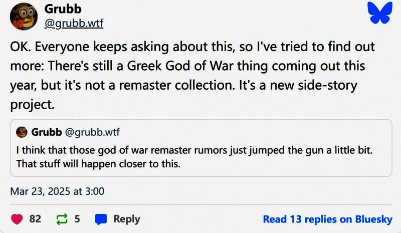 Grubb补充说,对于老三部曲复刻,自己从来没有听说过这种内部消息。当他问及三部曲复刻传闻时,其消息人士告诉他SIE不会在State of Play上公布任何《战神》的消息,但系列20周年庆典活动上会有事情公布。