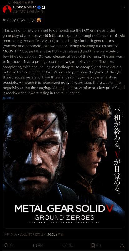 在《合金装备5:原爆点》发售 11 年后,制作人小岛秀夫在社交媒体上回忆了这款游戏发布时获得大量差评的感受。