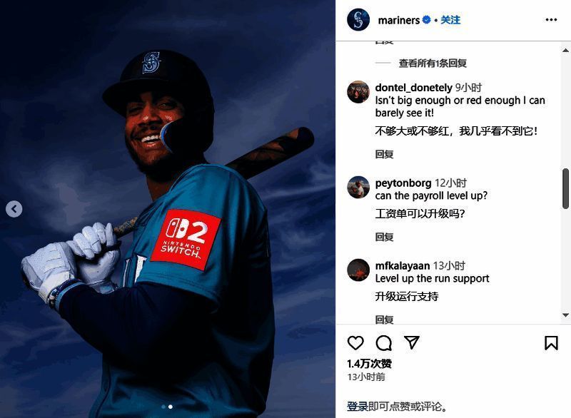 有一些信号表明Switch2更有可能在今年早些时候发布。MLB球队西雅图水手队通过Instagram宣布,他们将再次与任天堂合作(双方有悠久的合作历史,任天堂也曾是主要股东),在客场比赛时,他们的袖子将装饰有Switch2的标志。