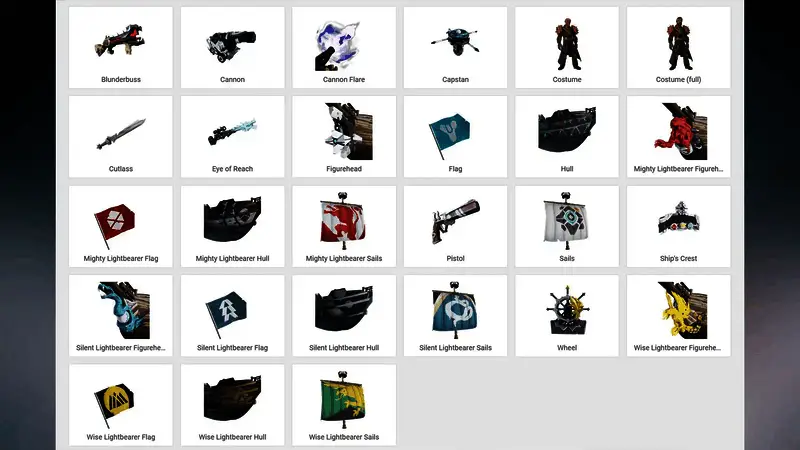 这一泄露首先是由UnknownCheats网站上的数据挖掘师kyattocc和Reddit用户发现的,其中有一套即将上线《盗贼之海》的《命运2》主题装扮,从发现的内容来看有新的武器、船只以及装扮等,以下为部分内容的相关图片。