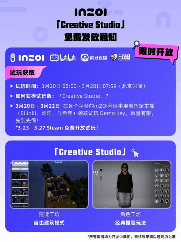 3月20日-3月22日在各个平台的《inZ0l》分区中观看指定主播(Bilibili、虎牙、斗鱼等)领取试玩Demo Key。
