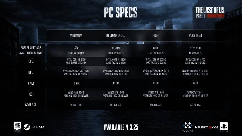 《最后的生还者2:重制版》将于4月3日登陆PC平台,近日索尼公布了该作PC配置需求,一起来看看吧!