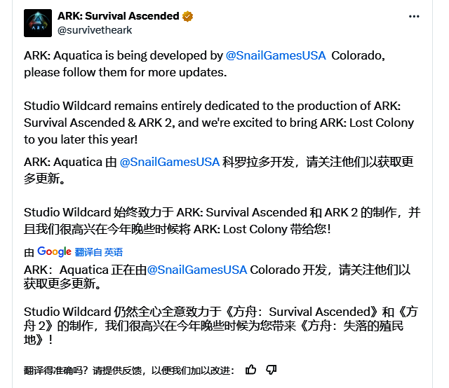近日,制作出DLC宣传片失落之地的《方舟:生存飞升》官方表示“《方舟:生存进化》由Snail Games USA Colorado开发,请关注他们以获取更多更新,Studio Wildcard完全致力于《方舟:生存飞升》和《方舟2》的制作,并期待在本年内将新DLC带给你们!”
